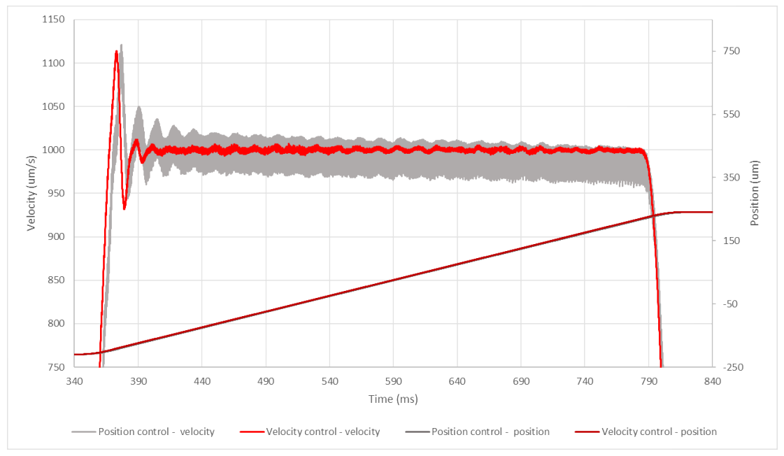 傳統(tǒng)壓電控制器:多數(shù)采用位置控制算法(灰色曲線),在高速運動場景中,無法維持準(zhǔn)確的速度控制,導(dǎo)致速度波動或跟蹤誤差,影響動態(tài)性能(如高速掃描的精度和效率)。