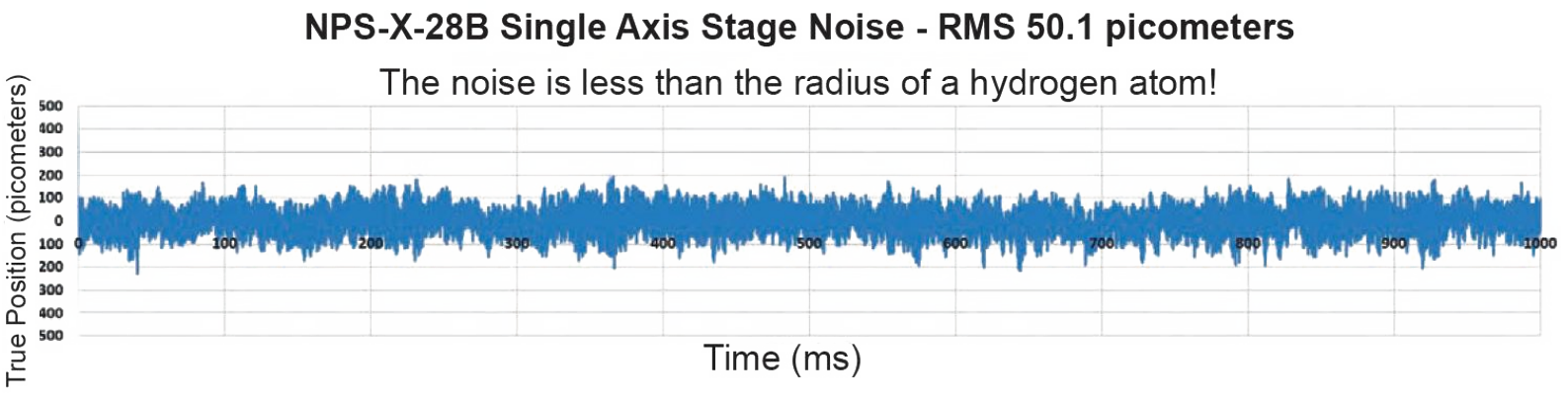 在實際測試中,單軸壓電平臺的位置噪聲為 50.1 pm RMS,這一噪聲水平小于氫原子半徑,適用于對精度和穩(wěn)定性要求高的場景,如尖端科學(xué)研究、精密測量或高端制造等領(lǐng)域。