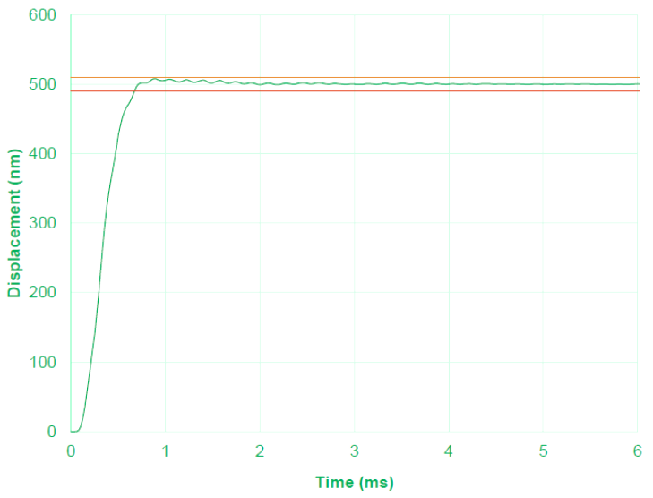 單軸壓電平臺完成 500 nm 階躍的整定時間小于 1 ms,反映其在動態(tài)控制場景中的快速響應(yīng)能力和穩(wěn)定性。
